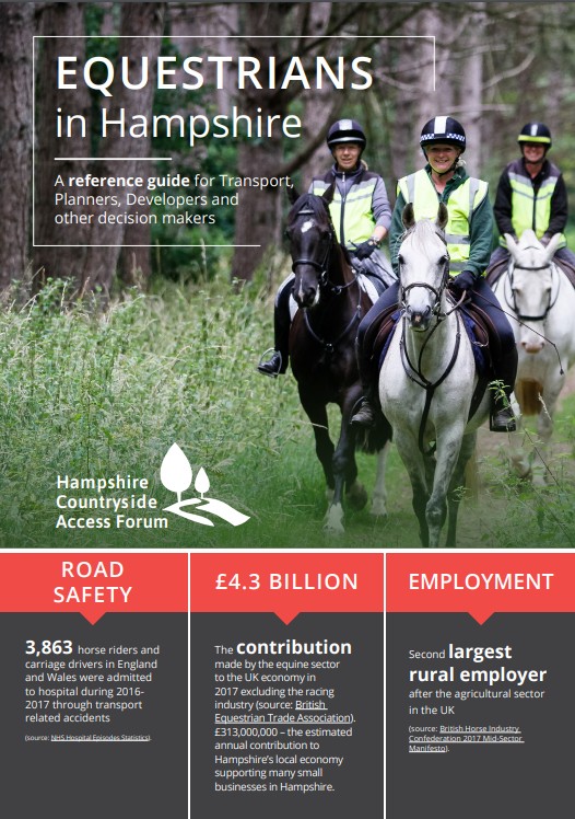 The Forum decided that a specific guidance document was required to raise the profile of horse riders and carriage drivers in the county. Aimed at decision makers, it places an emphasis on meeting safety needs for equestrians in accessing public rights of way now and in the future, as well as demonstrating the scale of the horse industry in Hampshire. This document brings together information which is currently not readily available in one place.